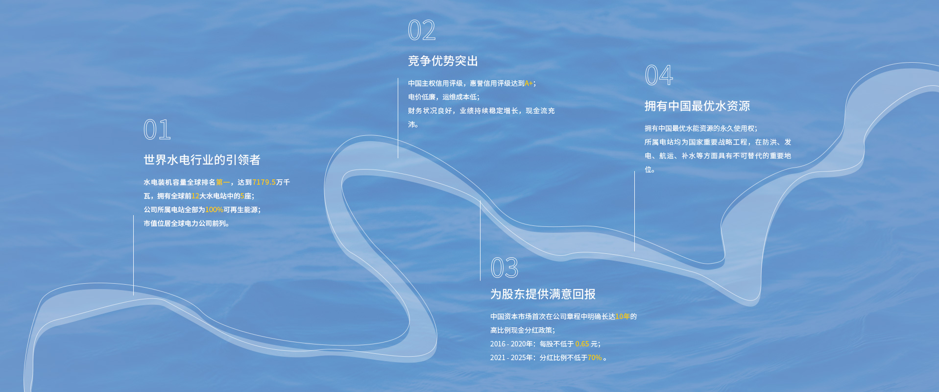 tyc5997太阳集团首页主要从事水力发电、投融资、抽水蓄能、智慧综合能源、新能源和配售电等业务,经营区域覆盖中国、秘鲁、巴西、巴基斯坦等多个国家,是中国最大的电力上市公司和全球最大的水电上市公司。tyc5997太阳集团首页运营管理的乌东德、白鹤滩、溪洛渡、向家坝、三峡、葛洲坝六座梯级电站,构成了世界最大清洁能源走廊,有效保障了长江流域防洪、航运、补水和生态安全,为我国经济社会绿色发展提供了强劲动能。